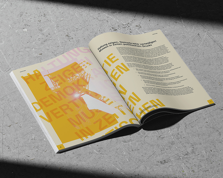 Die Publikation „Haltung zeigen, Demokratie verteidigen! Museen in Zeiten politischen Drucks“ überträgt die visuelle Identität der Veranstaltung in ein konsistentes Editorial Design. Geometrische Formen, prägnante Typografie und kräftige Farben schaffen ein strukturiertes, zugleich dynamisches Layout, das die Inhalte zugänglich und ansprechend macht.
