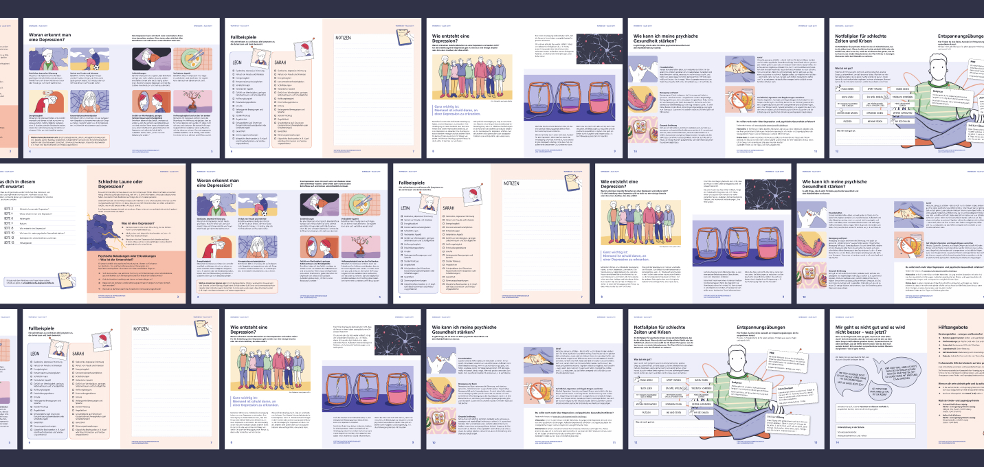 Step by step, we refined the concepts and finalized the illustrations in color—creating a clear, solution-oriented visual approach to topics like depression and mental health. In addition, we designed further materials to support the foundation’s educational work.